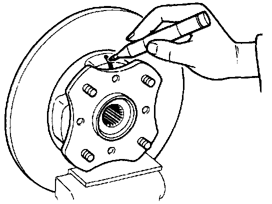 10. After marking the disc plate and wheel hub as shown, remove the four bolts from the back of the disc plate and remove from the hub.