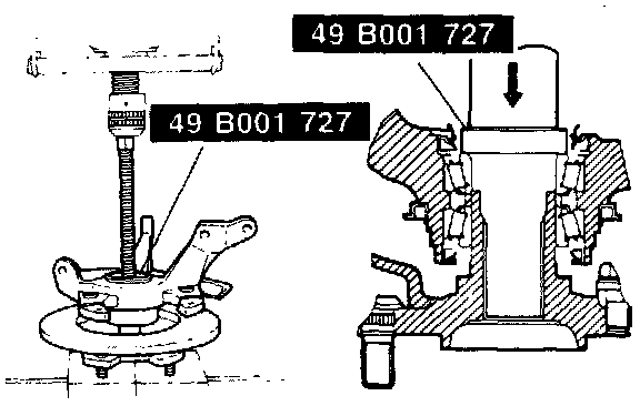 2. Using SST 49 B001 727 or equivalent, press wheel hub into knuckle assembly with 2500 Kg (5500 lbs) pressure.