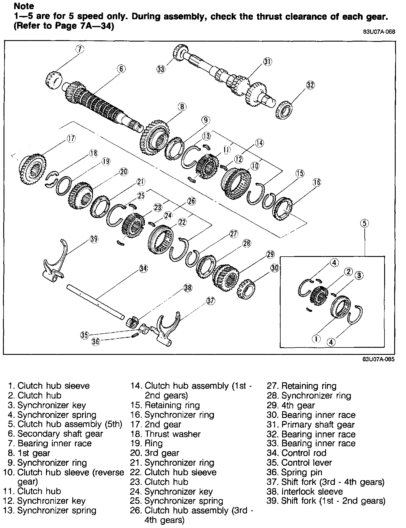 CAUTION: The synchronizer keys for the 5th gear are to be installed in one direction. The wider side face of the synchronizer key must be install to reverse gear direction.