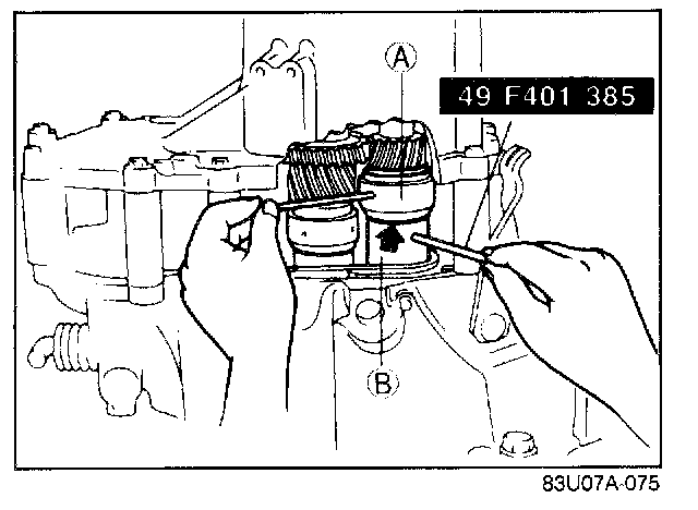 7. To seat the bearings, mount the SST on parts (A) and (B) of the selector, and then turn the selector so the gap shown by the arrow in the image is widened.