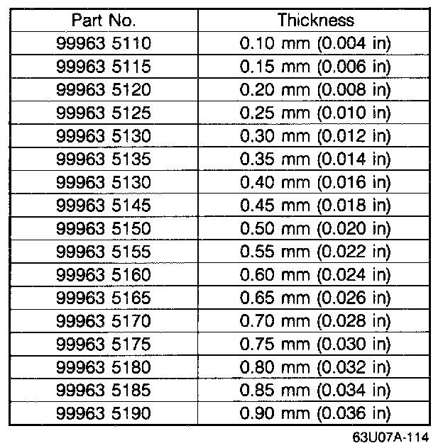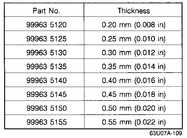 14. Select an appropriate adjustment shim to be used for the differential. It should be selected by referring to the table and selecting the shim which is nearest (on the large side) to the largest measured value of the gap in the selector.