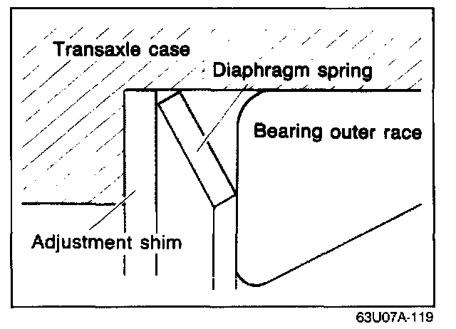 1. Install the selected adjustment shims and the diaphragm spring into the transaxle case.