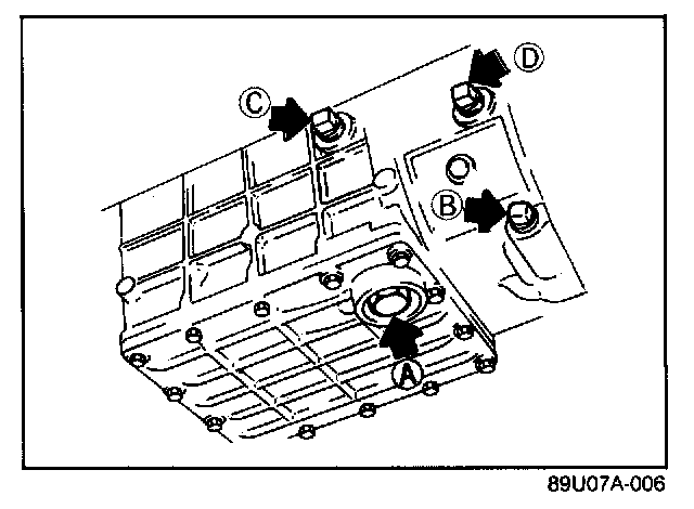 1. Remove the two drain plugs ((A) and (B)) and two plugs ((C) and (D)), and drain the oil into a suitable container.