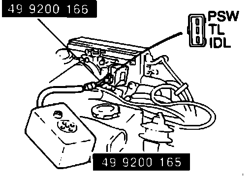 5. Connect the throttle sensor adjustment tool (Mazda Part# 49 9200 165) to the throttle sensor using the adapter (Mazda Part# 49 9200 166). If the special tool or adapter are not available, use an ohmmeter.