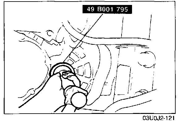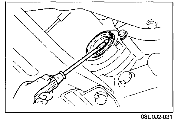 Jack up the vehicle and support it with safety stands. Drain the transaxle oil. Next, use the following procedure to replace the driveshaft oil seal: