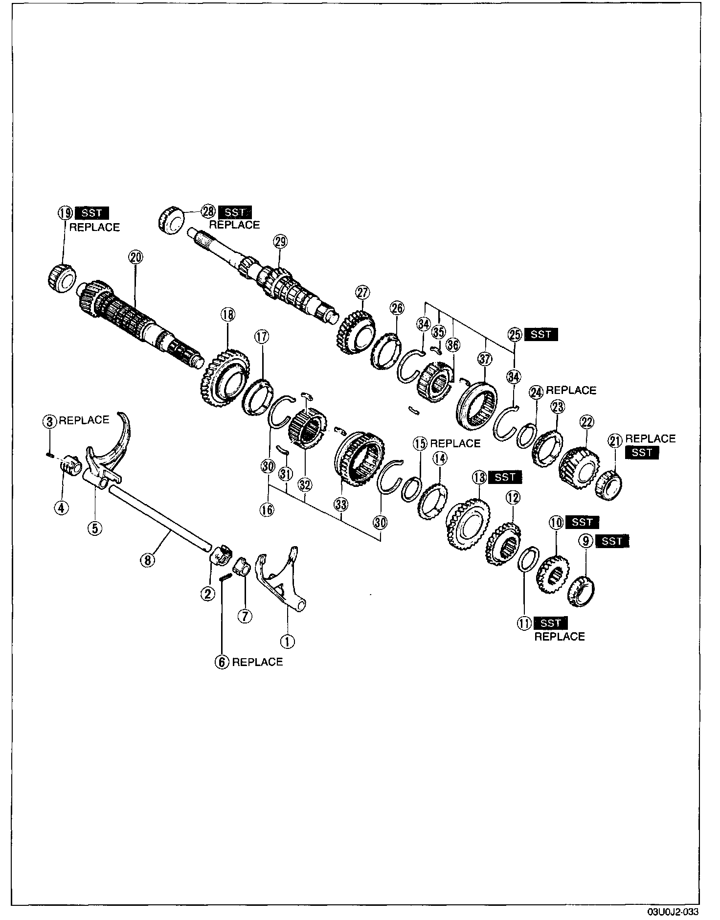 3. Remove the secondary 3rd gear and 2nd gear with the SST.