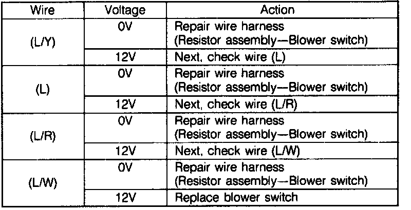 When the blower switch is in the OFF position, the motor ground circuit is open and the blower motor does not operate. When the switch is in the first (Low) position, current flow from the blower motor is restricted by the three resistors in the resistor assembly, and the blower motor turns at low speed. Changing the blower switch to the second (Mid), third (High), or fourth (Super-high) position causes the circuit resistance to decrease, and the blower motor speed becomes correspondingly faster.