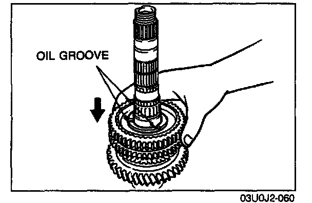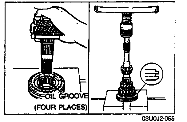 - Align the synchronizer ring groove and clutch housing hub key when installing.