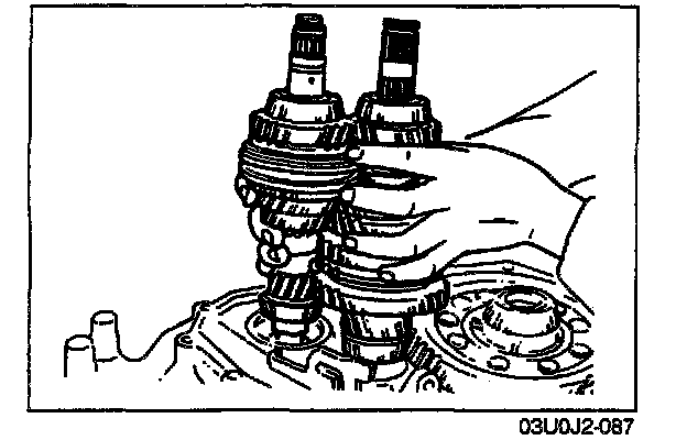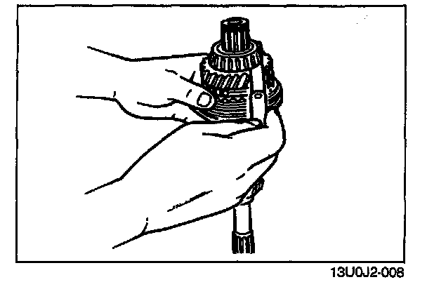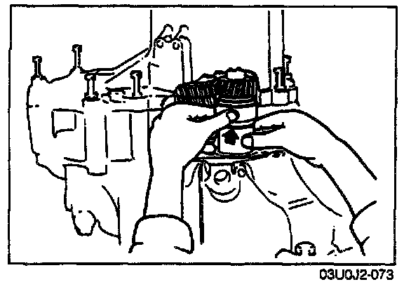 1. Install the clutch hub assembly (5th/Reverse) and the 5th/Reverse shift fork together.