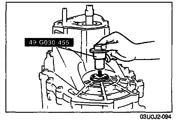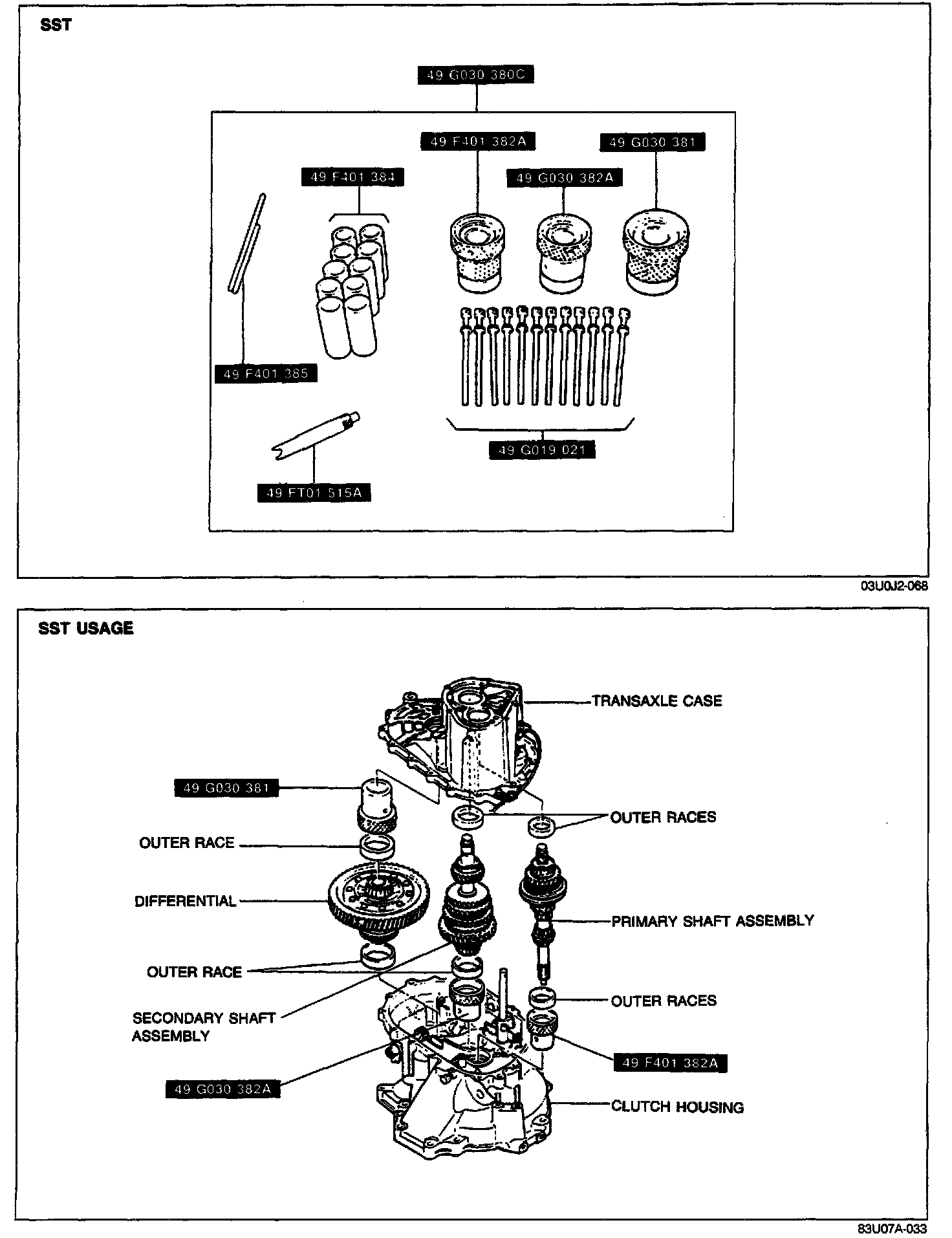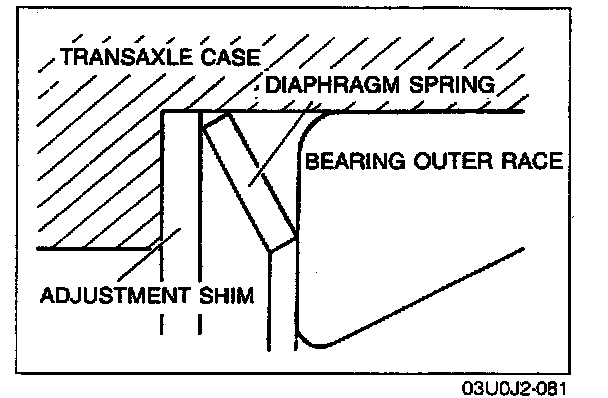 1. Install the primary and secondary shaft bearing outer races into the transaxle case (diaphragm springs and shims removed).