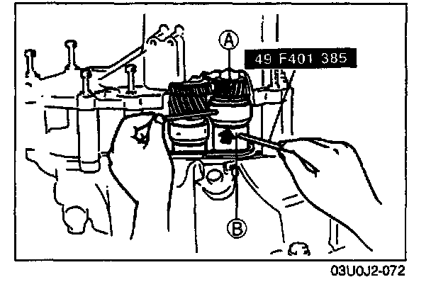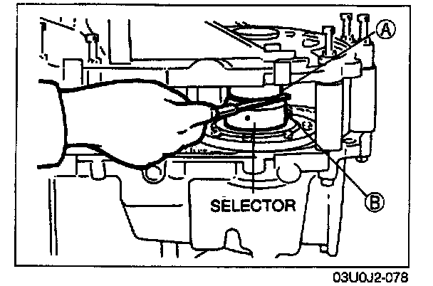7. To seat the bearings, mount the SST (bars) on parts (A) and (B) of the selector, and turn the selector so the gaps are widened.