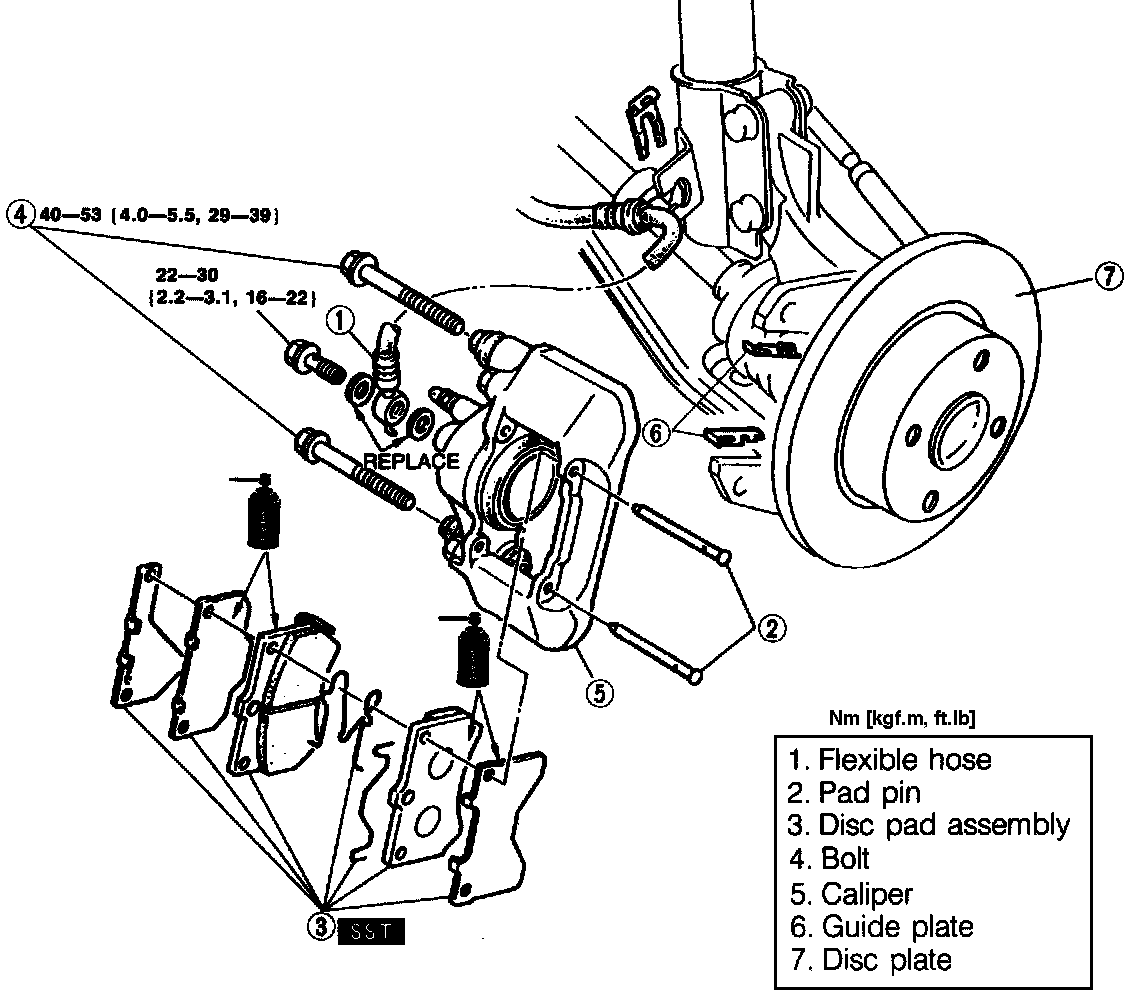 5. Reverse procedure to install. When installing new brake pads, push caliper piston inward using piston compressor No. 490221600C or equivalent.