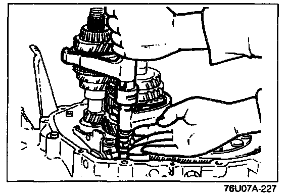 2. While holding the 1st-2nd shift fork with one hand and the 3rd-4th shift fork with the other, raise them both at the same time and shift each of the clutch hub sleeves.