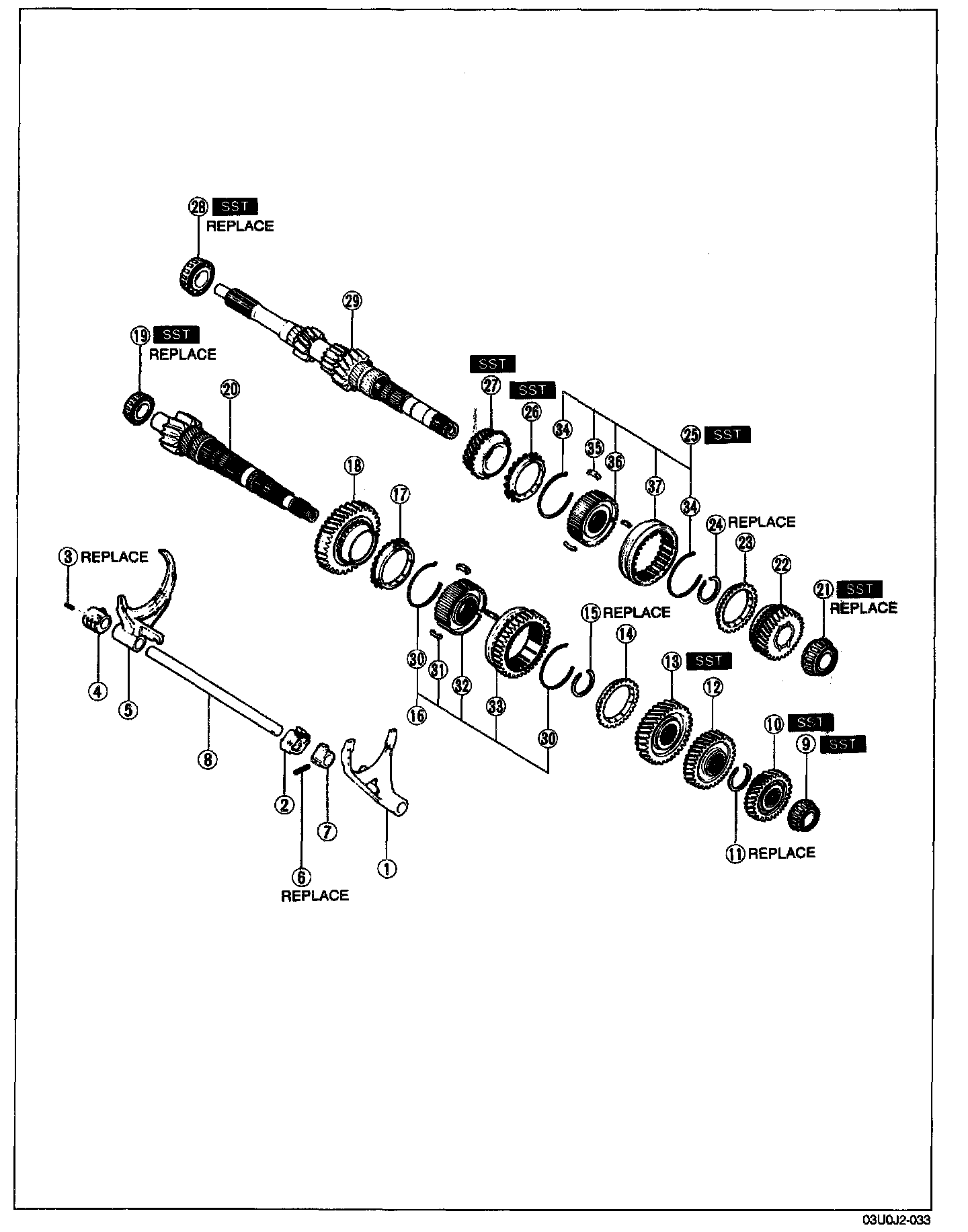 3. Remove the secondary 3rd gear and 2nd gear with the SST.