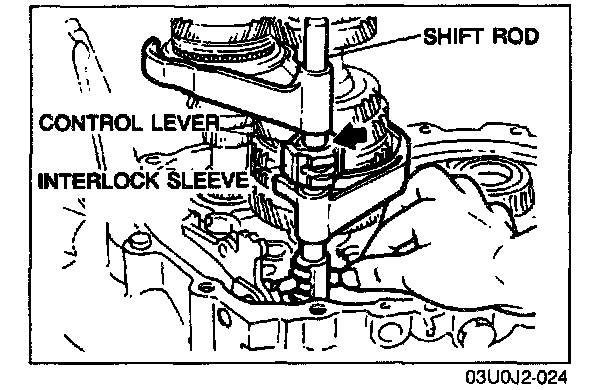 1. Align the ends of the interlock sleeve and of the control lever (arrow). Turn the shift rod counterclockwise.