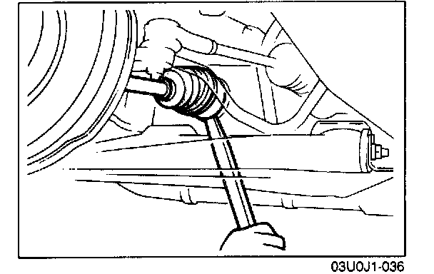 6. Disconnect the driveshaft from the transaxle by prying with a bar inserted between the outer ring and the transaxle.