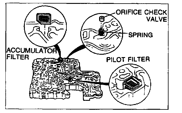 2. Install the pilot filter, accumulator filter, orifice check valve, and spring into their proper positions in the lower valve body.