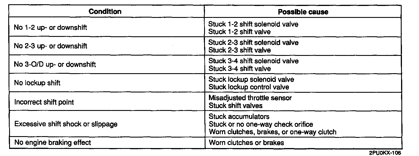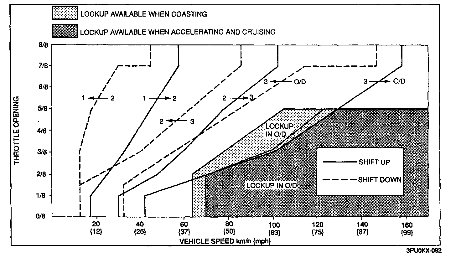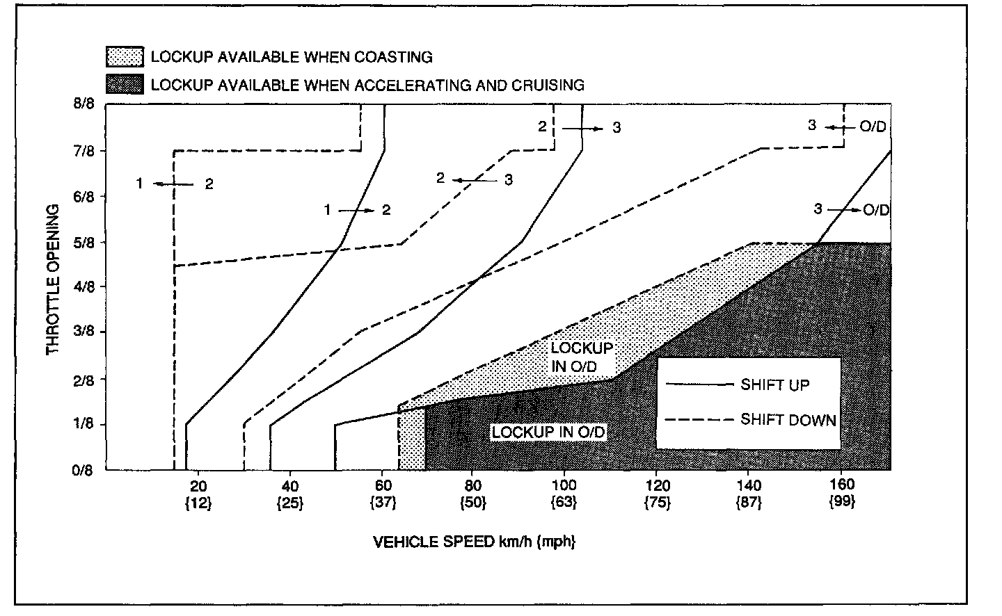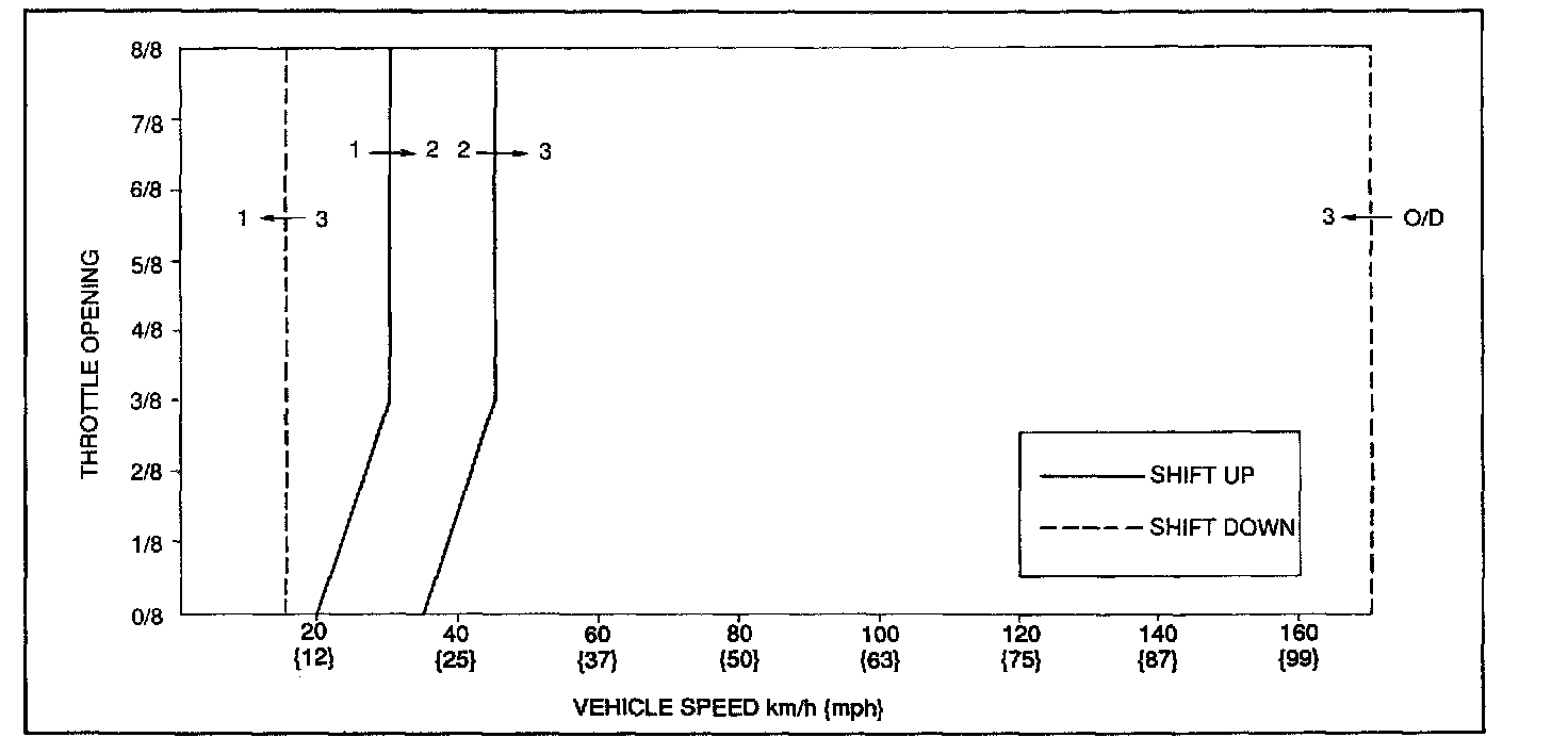 3. Verify that 1-2, 2-3, and 3-O/D upshifts, downshifts, and lockup are obtained. The shift points must be as shown in the D range shift diagram.