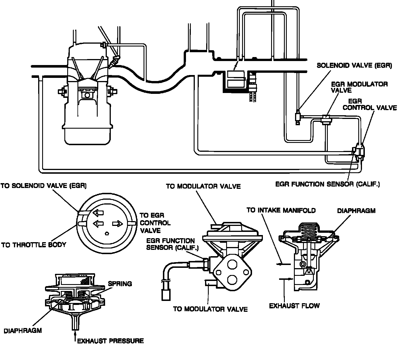 System recirculates a portion of exhaust gas through the EGR valve and intake manifold into the combustion chambers. Amount of exhaust gas recirculated is regulated by a PCME controlled solenoid valve, exhaust pressure modulator valve, and EGR control valve. System operates when coolant temperature is above 122°F (50°C).