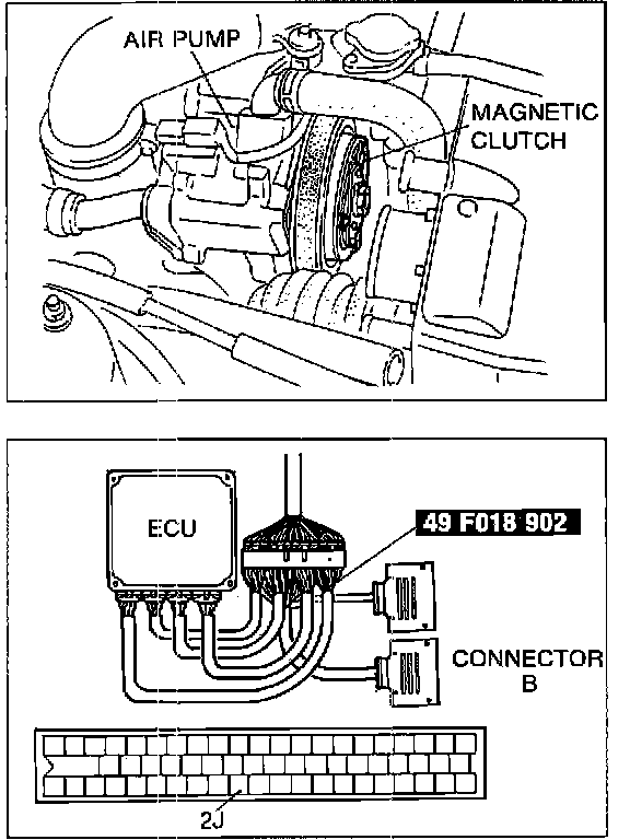 3. Turn ignition "ON." Short ECU terminal 2J and verify magnetic clutch is "OFF."