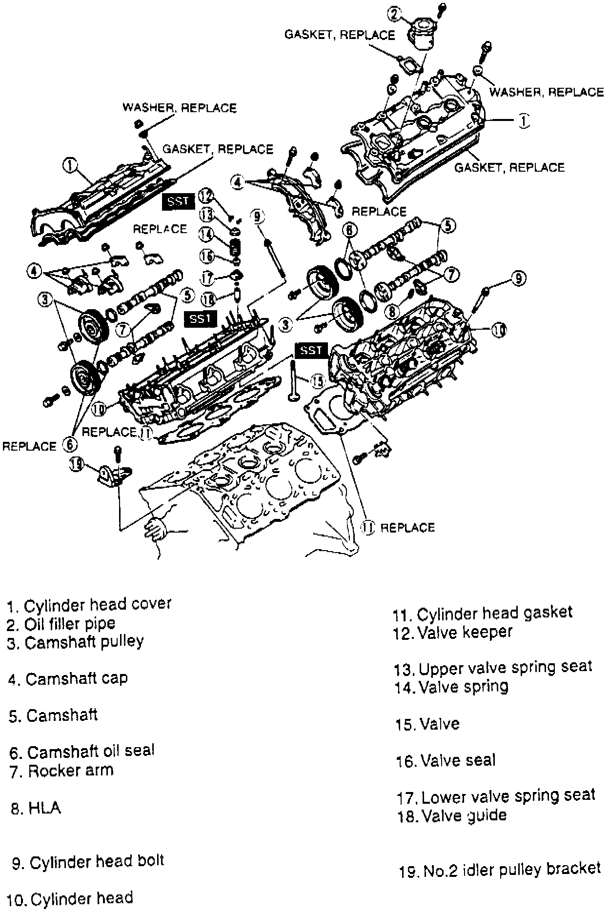 19. Remove camshaft pulleys, then loosen front cap bolts of lefthand side cylinder head.