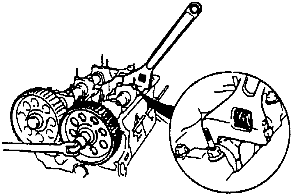18. Using an adjustable wrench to hold camshafts as shown in Fig. 12, remove camshaft pulley lock bolts.