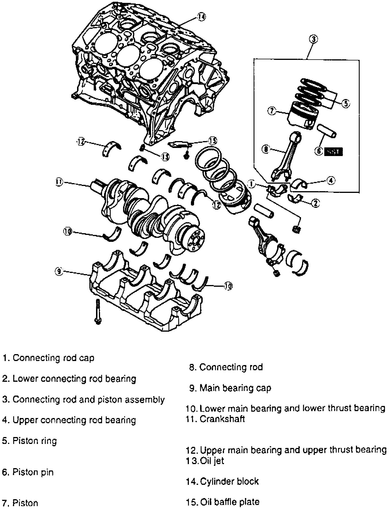 31. Remove oil pan baffle plate, oil pan upper block and oil strainer.