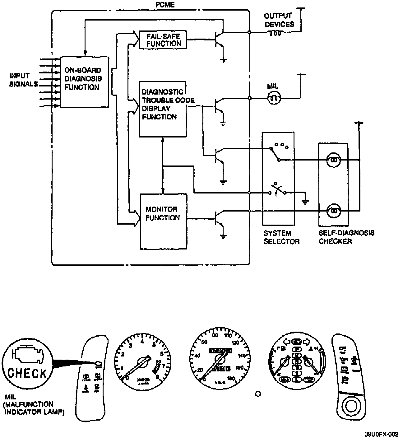 Failures of each input and output device are indicated and retrieved from the PCME as diagnostic trouble code (DTC) numbers.
