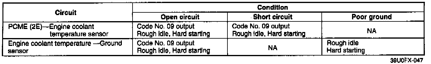 - If the temperature sensor or circuit has an open or short, Diagnostic Trouble Code No. 09 is output, and the PCME will use a preprogrammed temperature value of 80°C (176°F}.