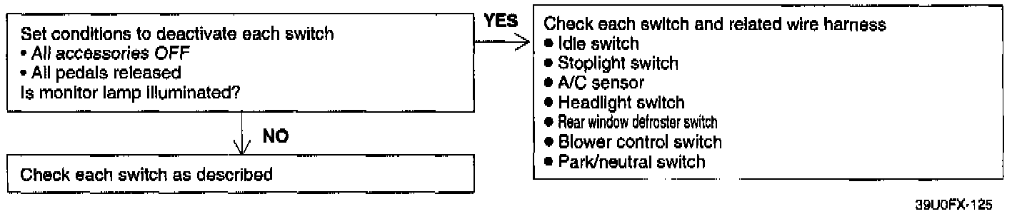 - If monitor lamp remains illuminated then each switch and related harness needs inspection until the faulty circuit and/or switch is identified.