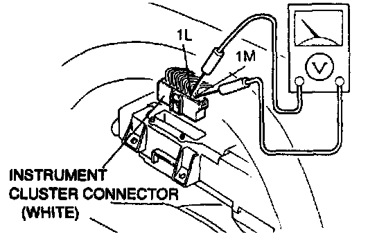 5. Measure the voltage between terminals 1L and 1M of the speedometer connector (harness side) with the rear wheels turning slowly.