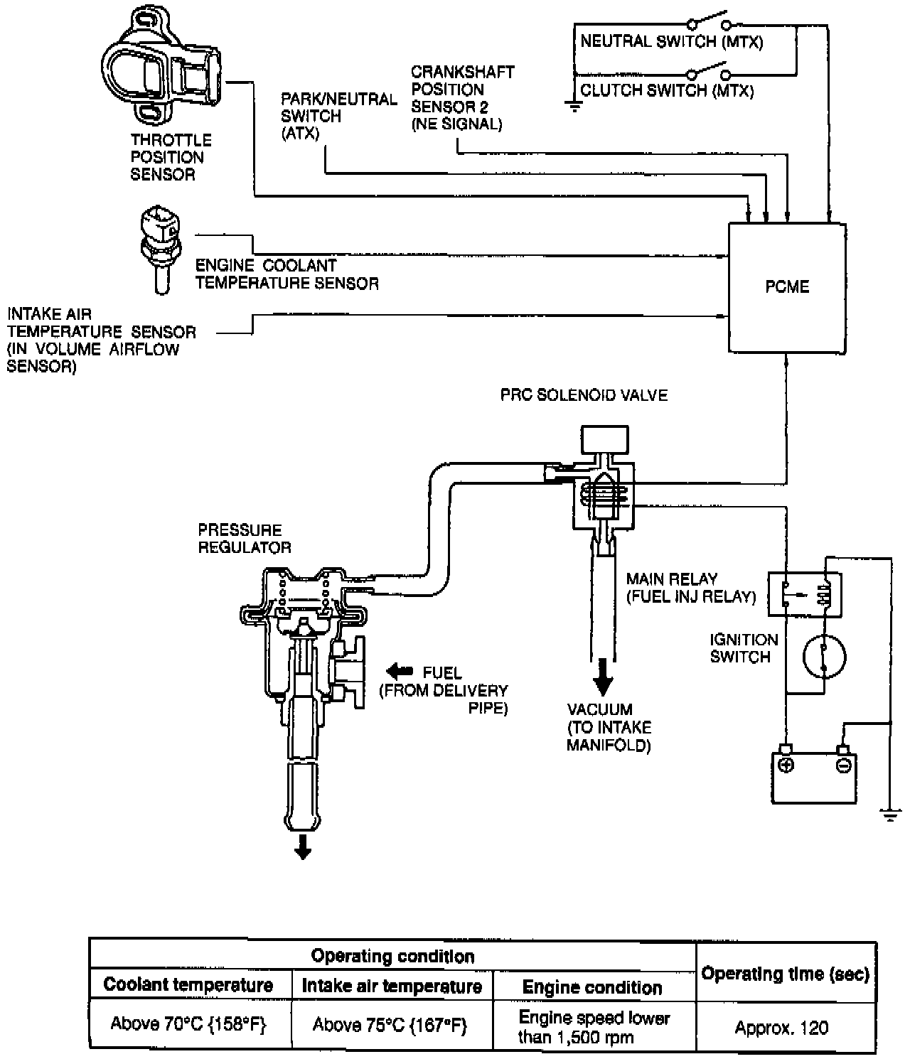 Idle, vacuum to the pressure regulator is momentarily cut and the fuel injection pressure is increased to slightly more than 284 kPa (41.2 psi). Pressure in the fuel line at idle is approx. 226 kPa (32.7 psi).