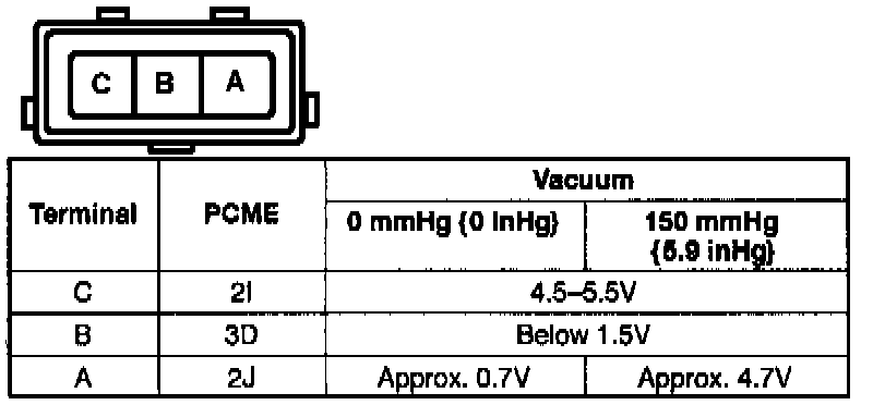 6. If not correct at terminal C, measure sensor resistance, then wiring harness and PCME terminal 2F.