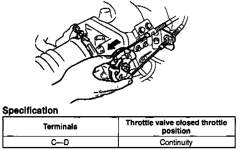 3. Insert a 0.5 mm (0.020 in) feeler gauge between stopper and throttle lever. Verify that there is no continuity across terminals C and D.