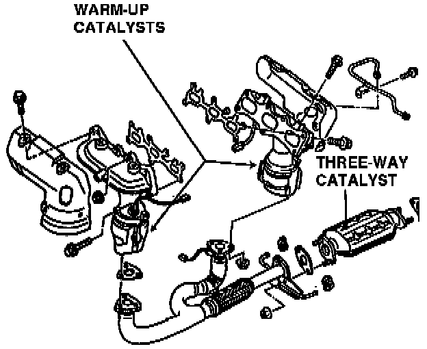 Two warm-up converters are mounted (one per engine bank) as part of the exhaust manifold assemblies.