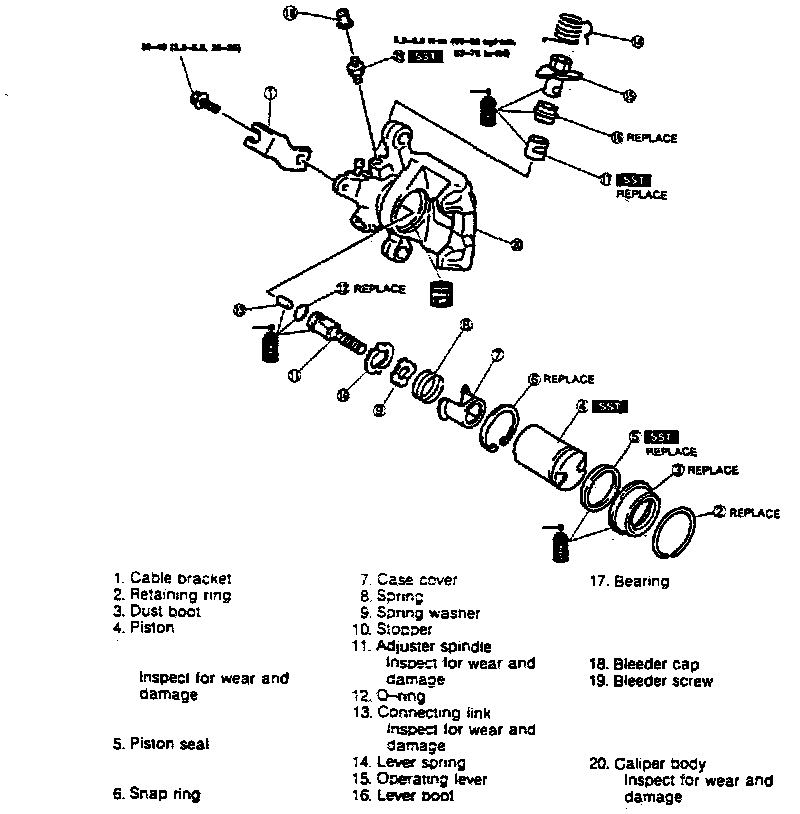 When overhauling caliper, refer to Fig. 10. When removing piston from caliper assembly, remove retainer and dust seal. Turn piston counterclockwise using piston holding tool No. 49FA18602 or equivalent and screw out piston from caliper assembly. Remove snap ring from caliper. Reverse numerical sequence in Fig. 10. for assembly.