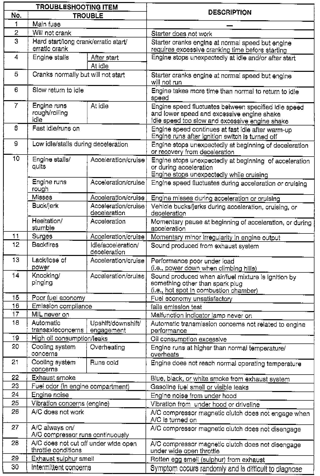 DESCRIPTION OF DRIVEABILITY PROBLEMS