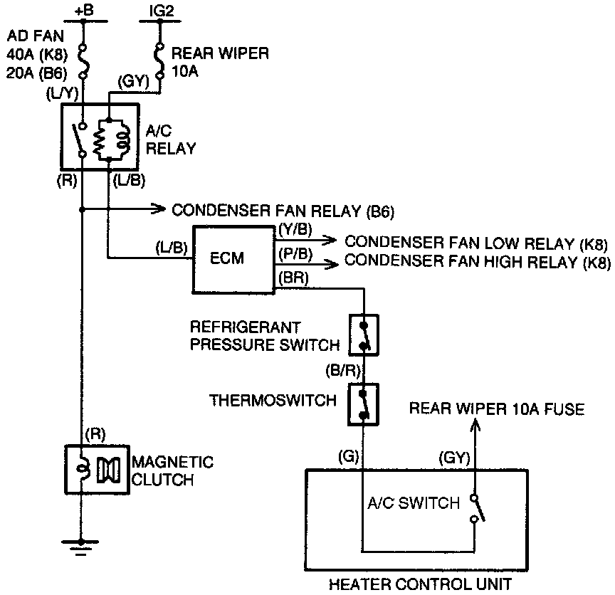 When the blower switch and the A/C switch are turned ON, power flows to ECM input terminal 1Q (BR wire). The ECM recognizes this signal as a demand for A/C ON operation. The ECM will control the ON/OFF operation of the A/C system from this point via the ground circuit for the air conditioner relay. The ground circuit for the A/C relay connects to ECM terminal 1J (L/B wire).