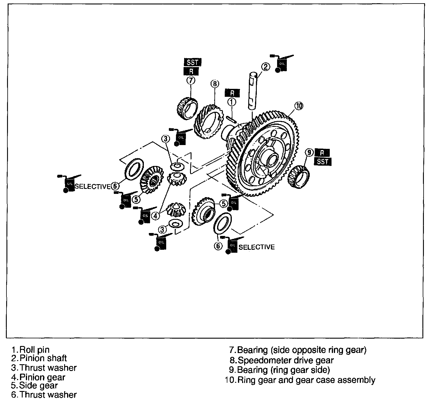 NOTE: The bearings do not need to be removed unless you are replacing them.1. Before disassembly, inspect the backlash of the side gears and pinion gears, referring to Inspection.
