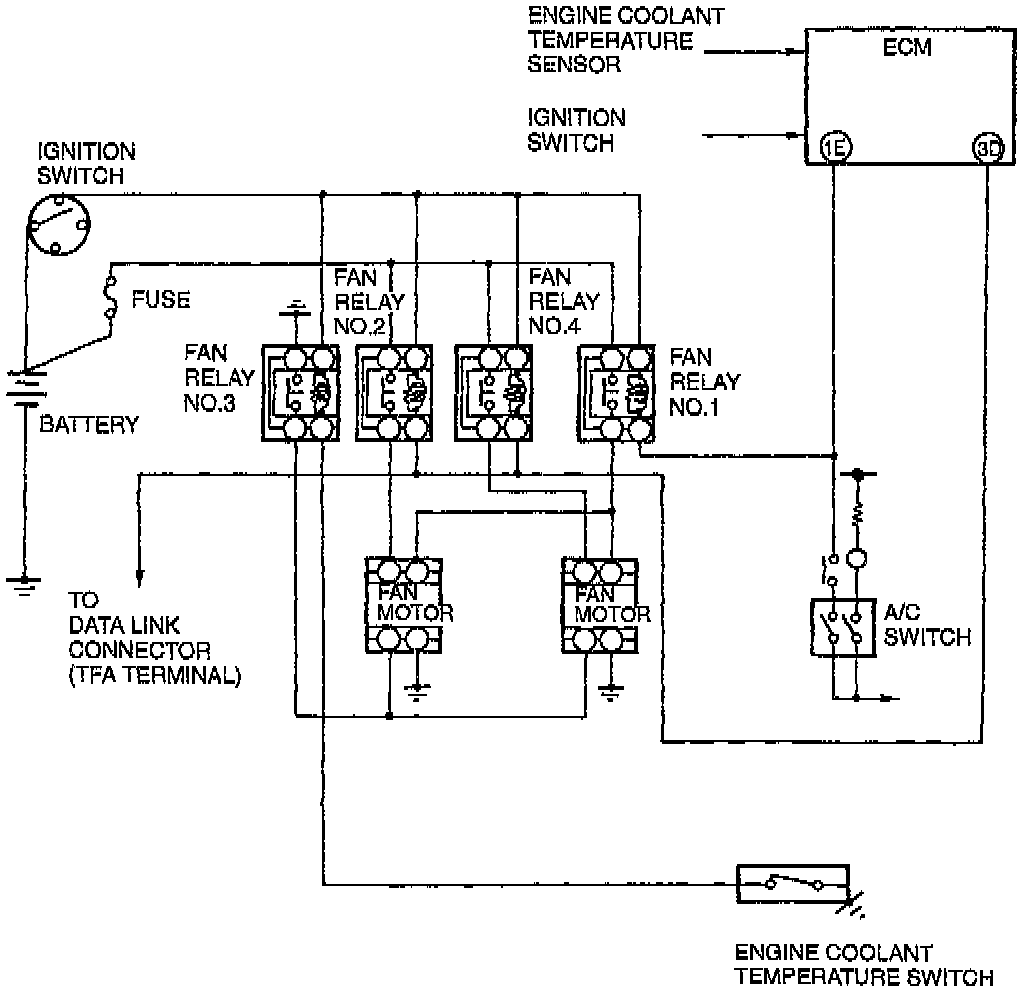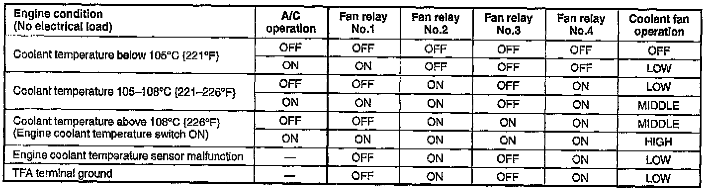 To improve idle smoothness and engine reliability, the electrical coolant fan control system controls the electrical fan speed by ECM (Engine Control Module). This system consist of the coolant fan, fan relays, ECM, and input devices.