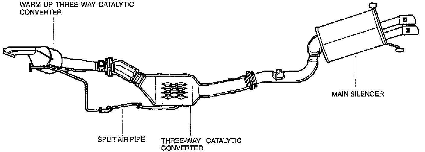 Two separate three-way catalytic converters are used to reduce CO, HC, and NOx emissions. For efficient operation, the warm up three way catalytic converter is placed close to the exhaust manifold so that it will heat up quickly and purify exhaust gas efficiently when engine runs at idle.