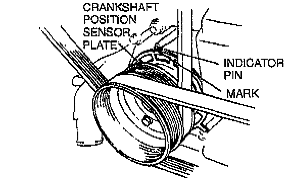 9. Verify that the timing mark (white) on the crankshaft position sensor plate is aligned with the indicator pin.