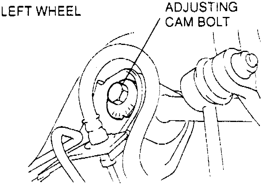 1. Loosen cam nut on upper lateral link.2. Turn cam bolt, Fig. 4, to provide correct camber angle, Fig. 5. Turning adjusting cam bolt one graduation changes camber about 7/30°.