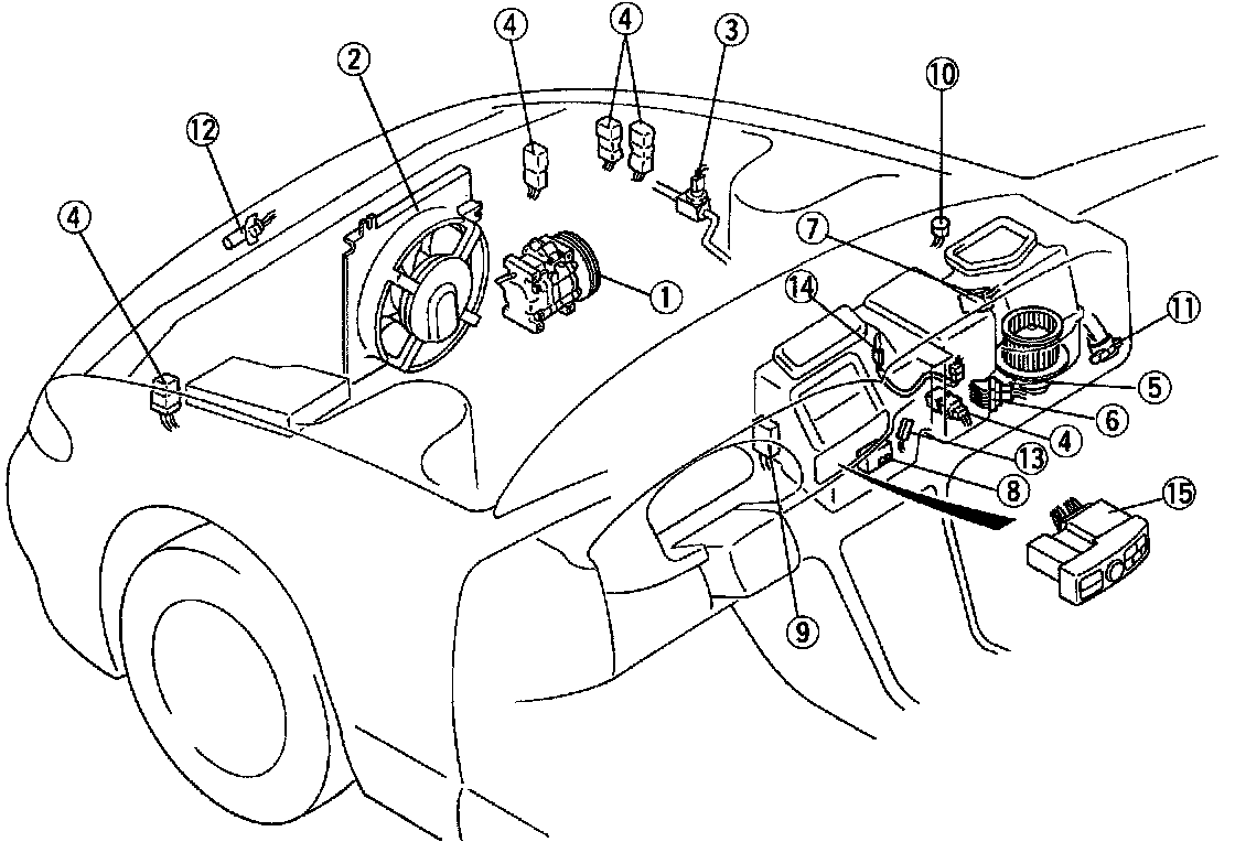 3. Refrigerant pressure switch 11. Passenger compartment temp. sensor