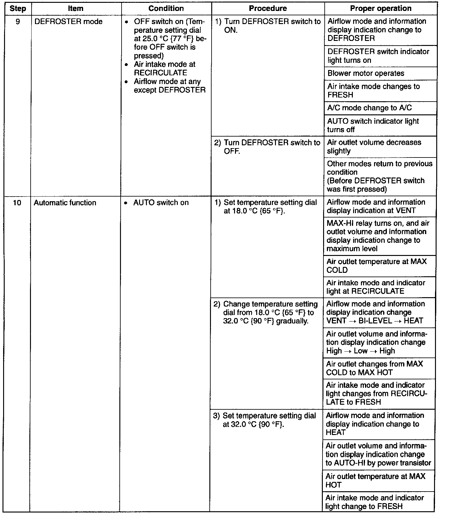 AFTER SERVICE OPERATION CHECKVerify that each control operates as described below after repairing the air conditioning system. Start and warm up the engine (so that the engine coolant temperature reaches 40 - 100 °C {104 - 212 °F}).