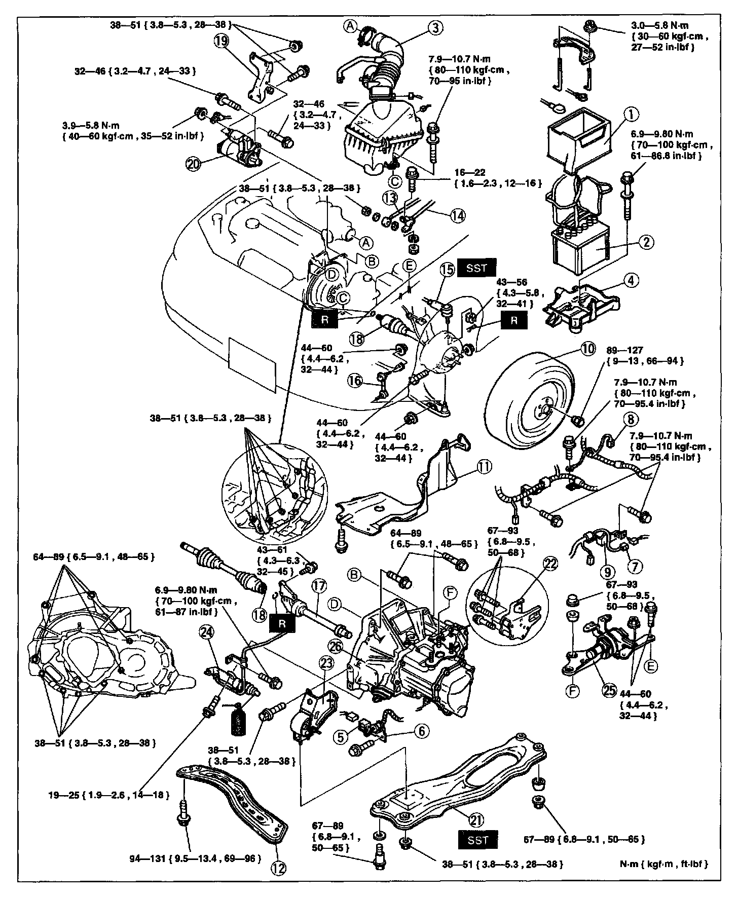 B: 38 - 51 N-m (3.8 - 5.3 kgf-m, 28 - 38 ft-lbf)