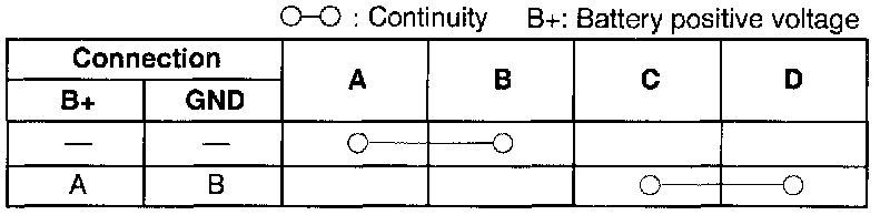 2. Apply battery voltage and check for continuity between the relay terminals.