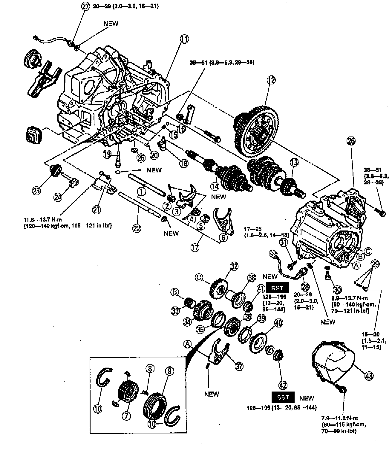 1. Apply a thin coat of sealant to the contact surfaces of the clutch housing and transaxle case, and tighten the transaxle case installation bolts to 38 - 51 Nm (28 - 38 ft. lbs.).
