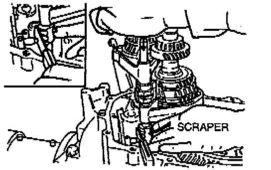 2. Insert the spring seat and spring into the reverse lever shaft. Install the steel ball, and place a scraper so that it contacts the steel ball.