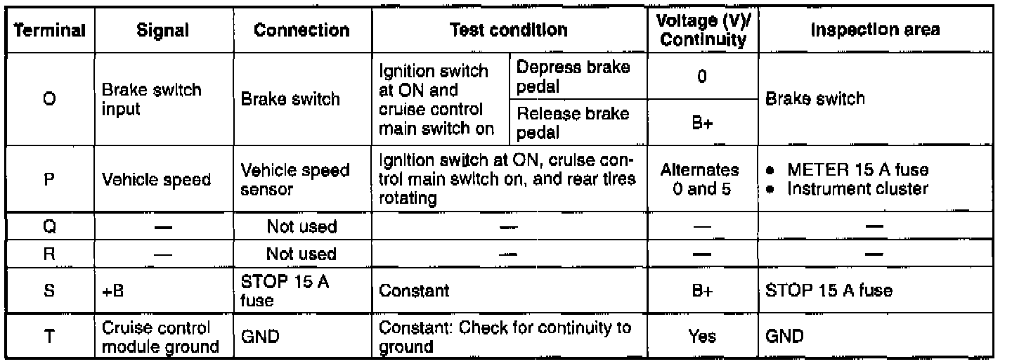 3. Measure the voltage at the cruise control module terminals as indicated below.